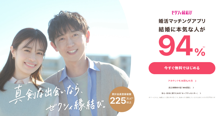 - ゼクシィ縁結び:結婚観マッチング機能で価値観の合う相手と出会える